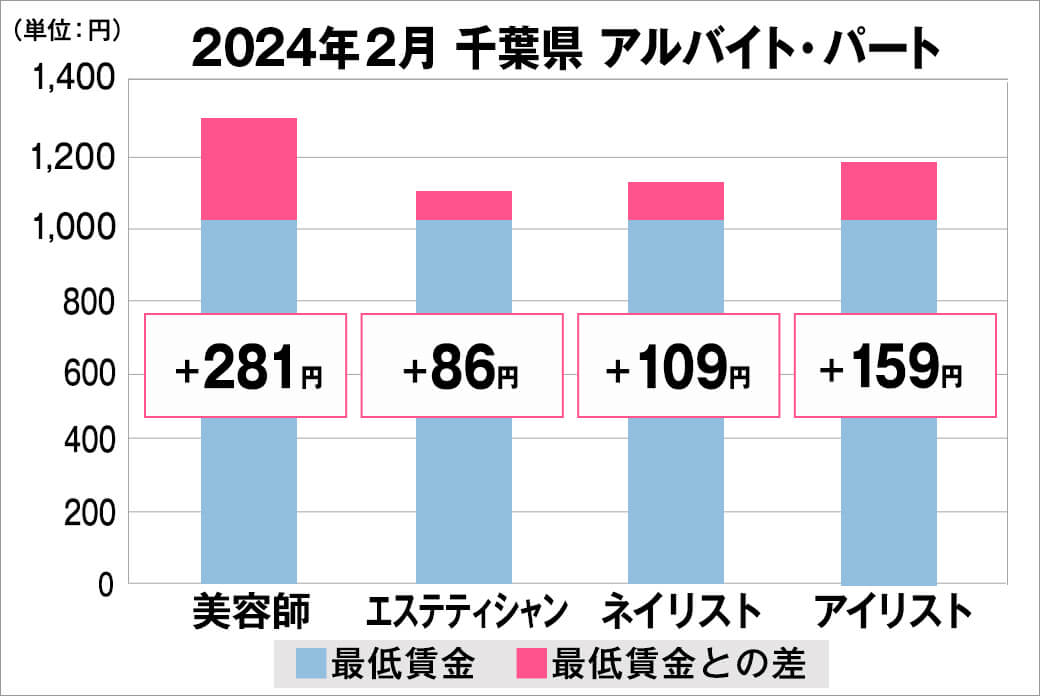 2024年2月時点で『美プロ』に掲載されている「千葉県」の「美容師・エステティシャン・ネイリスト・アイリスト」求人における「正社員」「アルバイト・パート」の給料を抽出。
