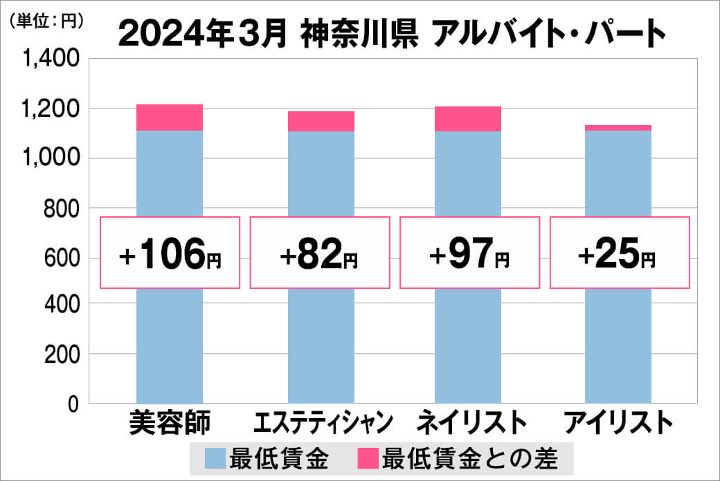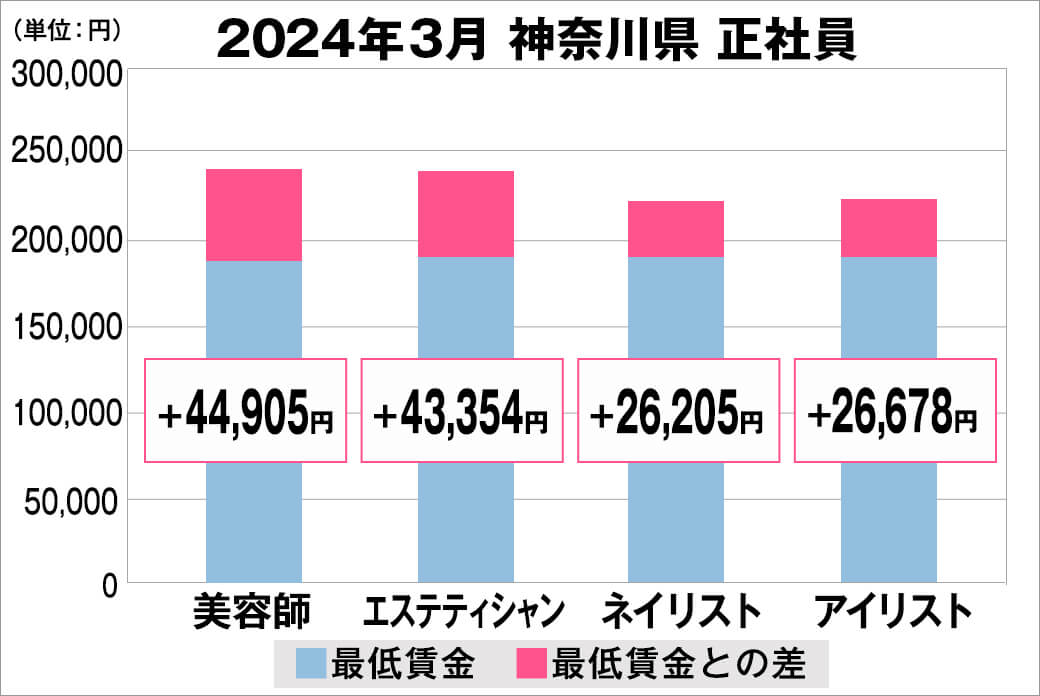 2024年3月時点で『美プロ』に掲載されている「神奈川県」の「美容師・エステティシャン・ネイリスト・アイリスト」求人における「正社員」「アルバイト・パート」の給料を抽出。