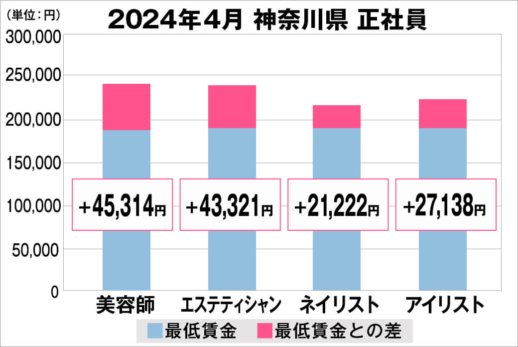 2024年4月時点で『美プロ』に掲載されている「神奈川県」の「美容師・エステティシャン・ネイリスト・アイリスト」求人における「正社員」「アルバイト・パート」の給料を抽出。