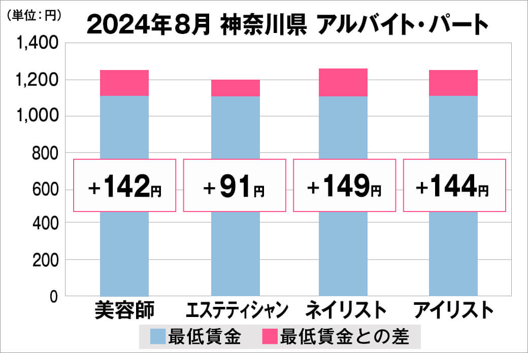2024年8月時点で『美プロ』に掲載されている「神奈川県」の「美容師・エステティシャン・ネイリスト・アイリスト」求人における「正社員」「アルバイト・パート」の給料を抽出。