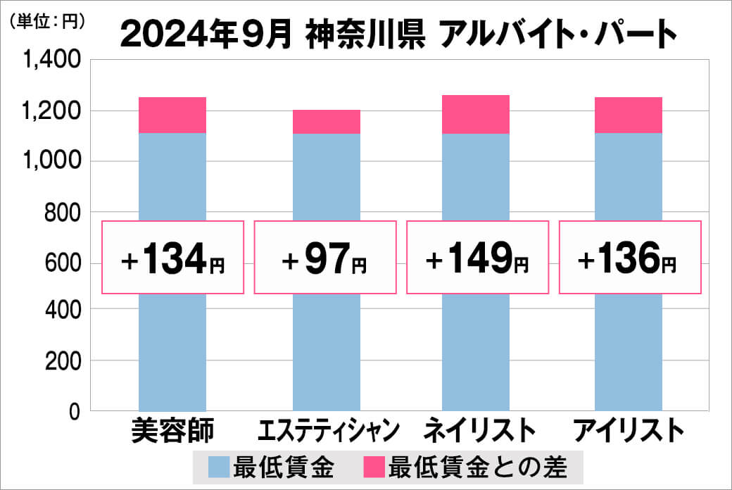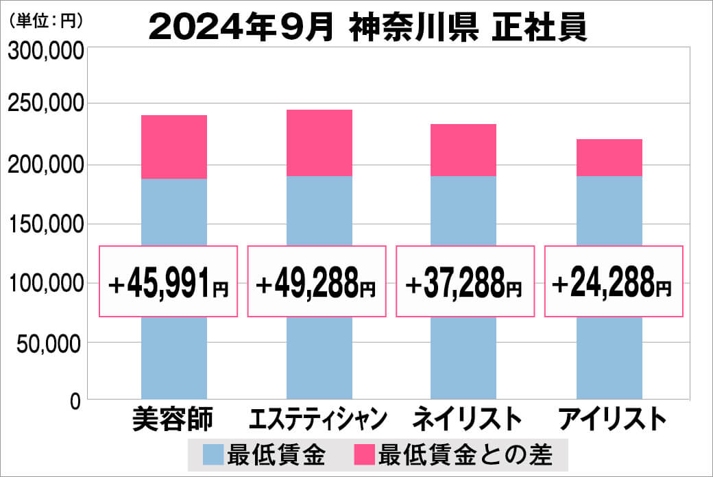 2024年9月時点で『美プロ』に掲載されている「神奈川県」の「美容師・エステティシャン・ネイリスト・アイリスト」求人における「正社員」「アルバイト・パート」の給料を抽出。