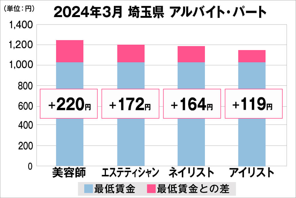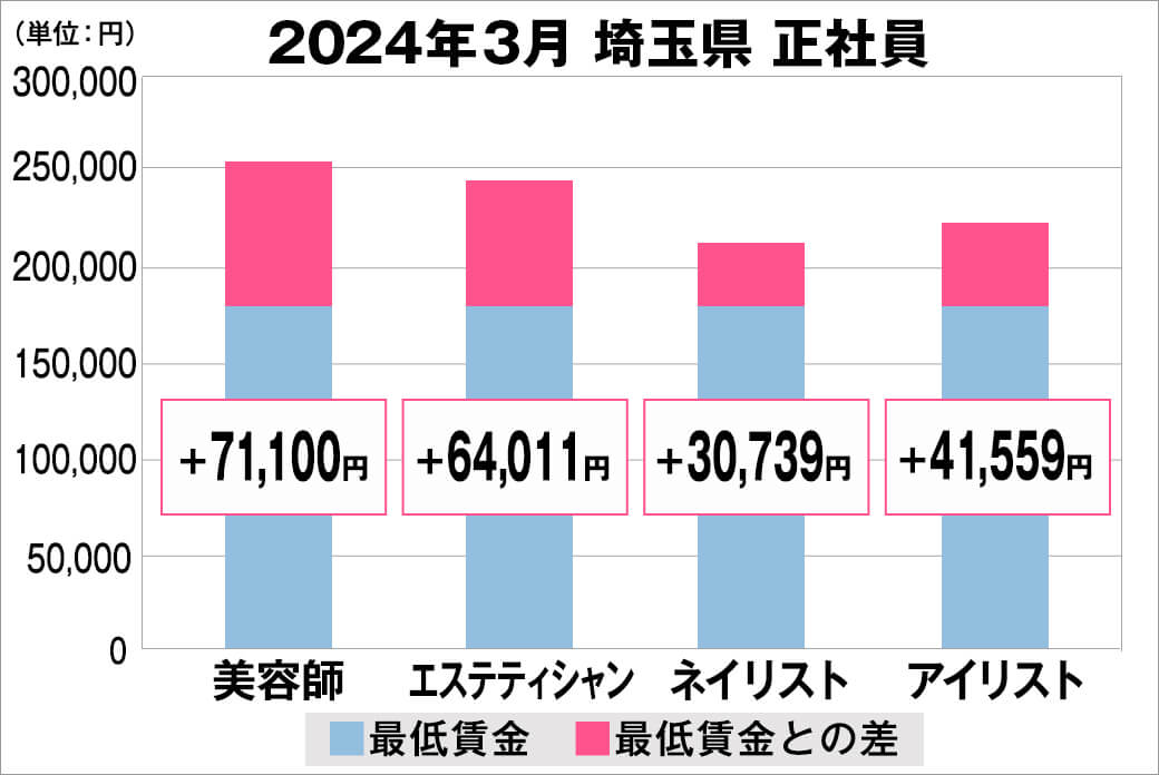 2024年3月時点で『美プロ』に掲載されている「埼玉県」の「美容師・エステティシャン・ネイリスト・アイリスト」求人における「正社員」「アルバイト・パート」の給料を抽出。