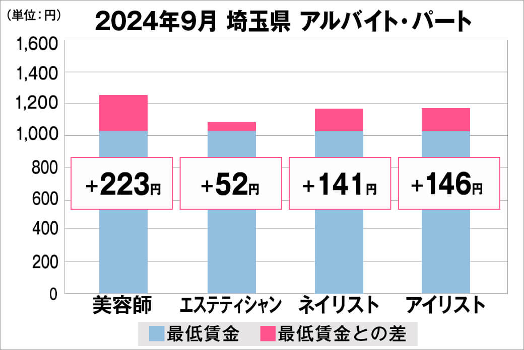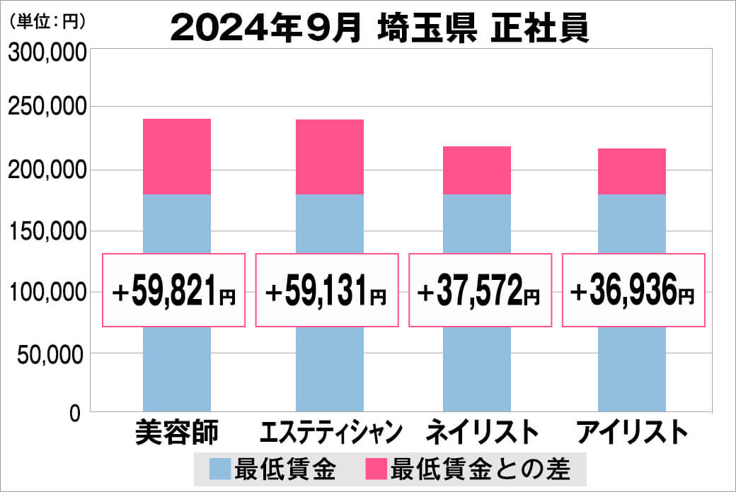 2024年9月時点で『美プロ』に掲載されている「埼玉県」の「美容師・エステティシャン・ネイリスト・アイリスト」求人における「正社員」「アルバイト・パート」の給料を抽出。