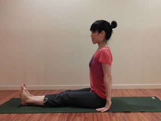 地面に長座の体勢で座り、かかとをできるだけ体から遠ざけるイメージで伸ばしていくのが杖のポーズ。このとき、上半身も地面と直角になるよう意識して伸ばしてくださいね。