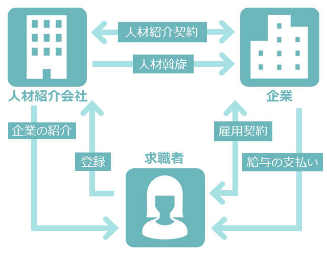 人材紹介会社は、働きたい求職者を採用したい企業に紹介し手数料を受け取るという仕組みになっています。求職者との雇用契約を結ぶ人材派遣元とは違い、人材紹介会社では雇用はせずあくまでも求職者とのマッチングや選考のサポートまでです。