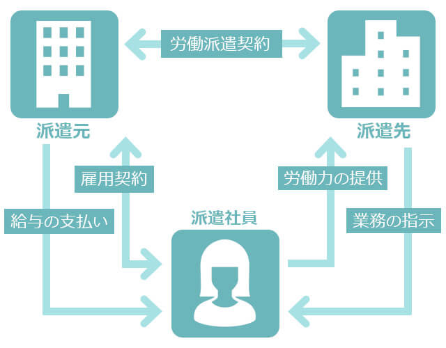 派遣の仕組みで耳にするのが、「派遣先」「派遣元」「派遣社員」というワード。この3つは、以下の画像のような関係性になっています。