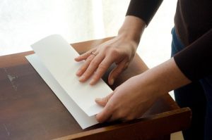 販売されている履歴書のほとんどは、すでに折り目がつけられていますが、一部の履歴書や自作のものを使用する場合は自分で二つ折りしなくてはいけません。折り目がずれないよう気をつけて軽く折り目をつけたあと、定規を使ってなぞるとキレイな折り目をつけることができます。履歴書に汚れがつかないよう、履歴書のインクがちゃんと乾いているかを確認し、テーブルの上をきちんと拭いておくのも重要です。