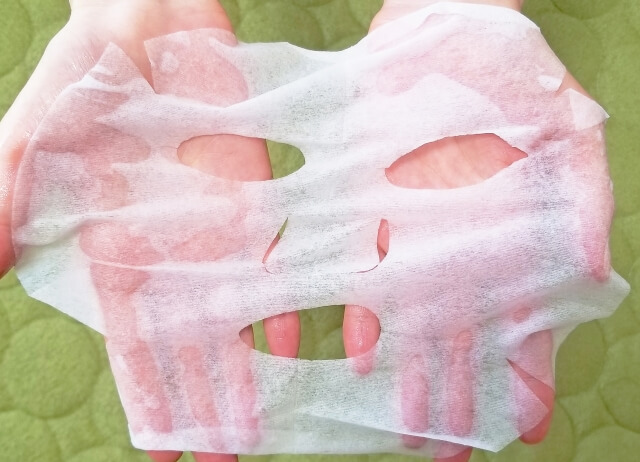 化粧水の後は、美容液成分がたっぷり沁み込んだフェイスマスクを顔にのせます。フェイスマスクによっては、別で美容液を付けると効果が上がるものもありますので、その場合、フェイスマスクを付ける前に美容液を塗ってくださいね。
