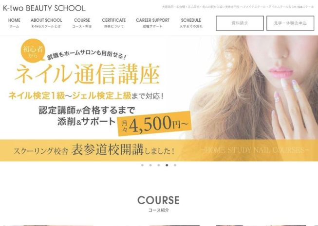トータルビュティーサロンの「K-two」の提携校「K-twoメイク&ネイルスクール」では、通信講座だけでは不安という方でも安心のスクーリングがあるのがうれしい。直営サロンを持つK-twoならではの現場のノウハウを直接講師より学べるのが特徴です。