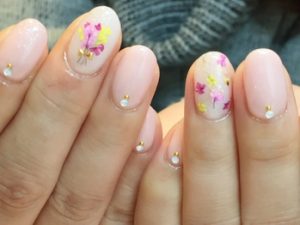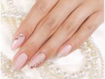 シンプルなワンカラーには、パールをワンポイントで使うとエレガントな印象に。爪の根元に沿って並べるのがおすすめです。